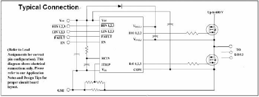 •主要特點:浮動通道設(shè)計用于自啟動操作,完全工作到+ 600v,可承受負(fù)瞬態(tài)電壓,柵極驅(qū)動供電范圍從10v到20v,所有通道欠壓鎖定,過流關(guān)斷關(guān)閉所有六個驅(qū)動器,獨立的3個半橋驅(qū)動器,所有通道匹配的傳播延遲,交叉?zhèn)鲗?dǎo)防止邏輯,低側(cè)輸出與輸入失相。3.3 V邏輯兼容,低電壓柵極驅(qū)動,抗噪性更好,外部可編程延遲,故障自動清除,所有部件均無鉛