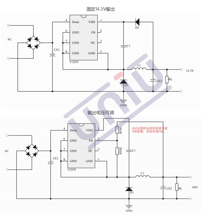 U3209是一款高性能低成本PWM控制功率器,適 用于離線式小功率降壓型應(yīng)用場合,外圍電路簡單、器 件個數(shù)少。同時產(chǎn)品啟動模塊內(nèi)置高耐壓MOSFET可提 高系統(tǒng)浪涌耐受能力。 與傳統(tǒng)的PWM功率開關(guān)不同,U3209內(nèi)部無固定 時鐘驅(qū)動MOSFET,系統(tǒng)開關(guān)頻率隨負(fù)載變化可實現(xiàn)自 動調(diào)節(jié)。同時芯片采用了多模式PWM控制技術(shù),有效 簡化了外圍電路設(shè)計,提升線性調(diào)整率和負(fù)載調(diào)整率并 消除系統(tǒng)工作中的可聞噪音。此外,芯片內(nèi)部峰值電流 檢測閾值可跟隨實際負(fù)載情況自動調(diào)節(jié),可以有效降低 空載情況下的待機功耗。 U3209集成有完備的帶自恢復(fù)功能的保護(hù)功能: VDD欠壓保護(hù)、逐周期電流限制、輸出過壓保護(hù)、過熱 保護(hù)、過載保護(hù)和 VDD 過壓保護(hù)。