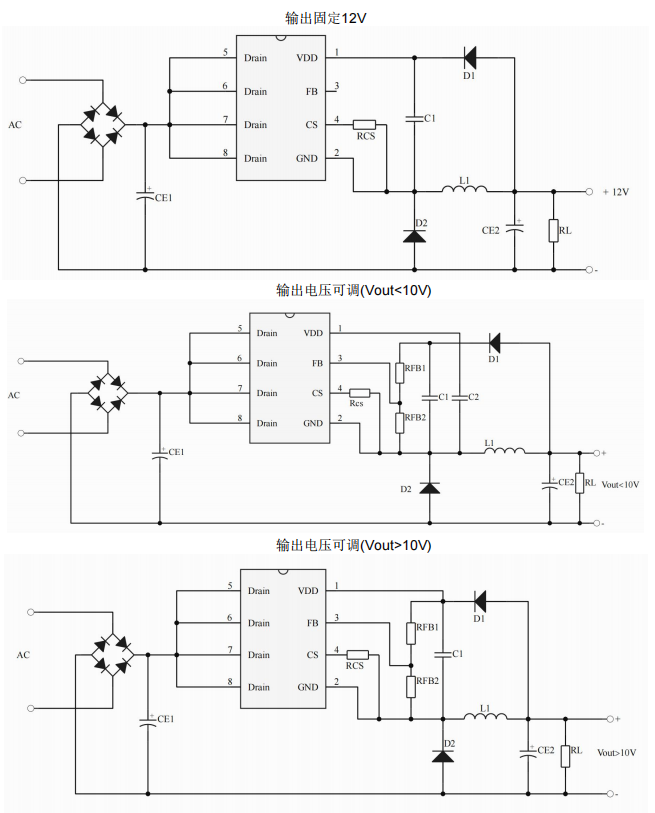 •主要特點:集成 650V 高壓啟動電路;多模式控制、無異音工作;支持降壓和升降壓拓撲;默認 12V 輸出( FB 腳懸空);待機功耗低于 50mW;良好的線性調(diào)整率和負載調(diào)整率;集成軟啟動電路;內(nèi)部保護功能 :過載保護 (OLP);逐周期電流限制 (OCP);輸出過壓保護 (OVP);VDD 過壓、欠壓和電壓箝位保護